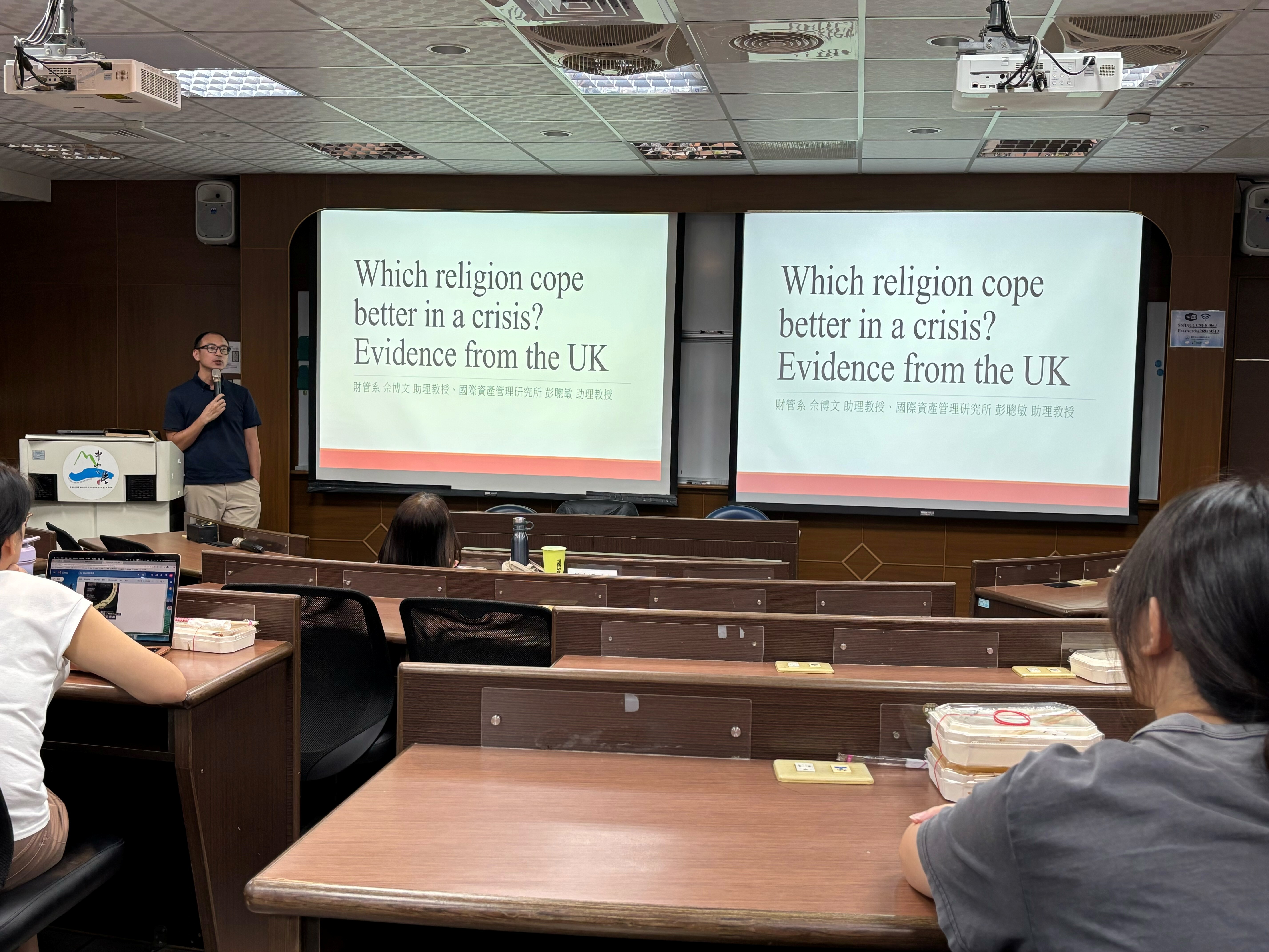 最後登場的是財管系的佘博文助理教授與國際資產管理研究所彭聰敏助理教授的研究主題:Which Religion Cope Better in a Crisis? Evidence from the UK